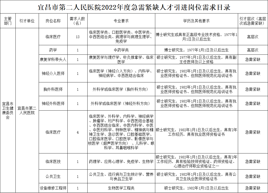 为进一步满足市直事业单位用人需求,按照《宜昌市高层次创新创业人才和急需紧缺人才引进工作暂行办法》(宜办发〔2016〕18号)规定,现将《宜昌市第二人民医院2022年度急需紧缺人才引进岗位需求目录》(以下简称《目录》)予以公告。凡符合《目录》确定的专业、学历、年龄及职称(资格)等条件者,可直接与引才单位联系,联系电话:0717-6742723,咨询相关事宜。